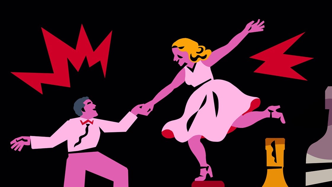 It’s a happy, seasick song that accentuates the strong voices of both singers. While they woozily harmonize and belt, they dance. Sergio Trujillo and Karla Puno Garcia have choreographed evocative, efficient, droll numbers that call to mind old show-biz glamour, and also the dark-edged phrase “high functioning”—how a pair of really fizzy drunks can look and feel great while spinning ever closer to the brink.